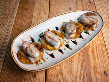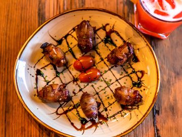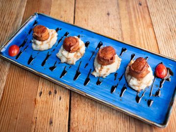 Bacon wrapped scallops, Manchego mashed potatoes, reduced vinaigrette