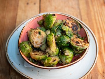 Brussels sprouts, garlic, wine, oregano, olive oil, Marcona almonds, tomato sauce