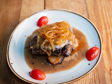 Filet mignon tips, onions, sweet red and green peppers, saffron rice