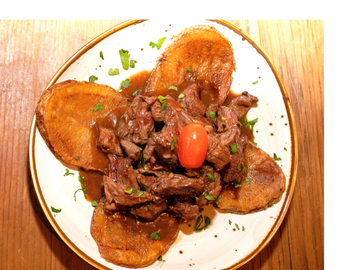 Skirt steak, garlic, parsley, wine, sliced potatoes