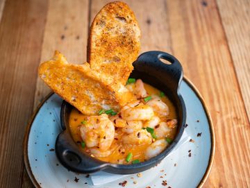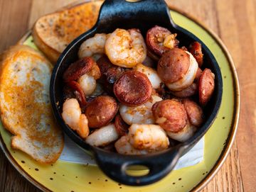 Shrimp, garlic, sherry wine sauce, grilled bread